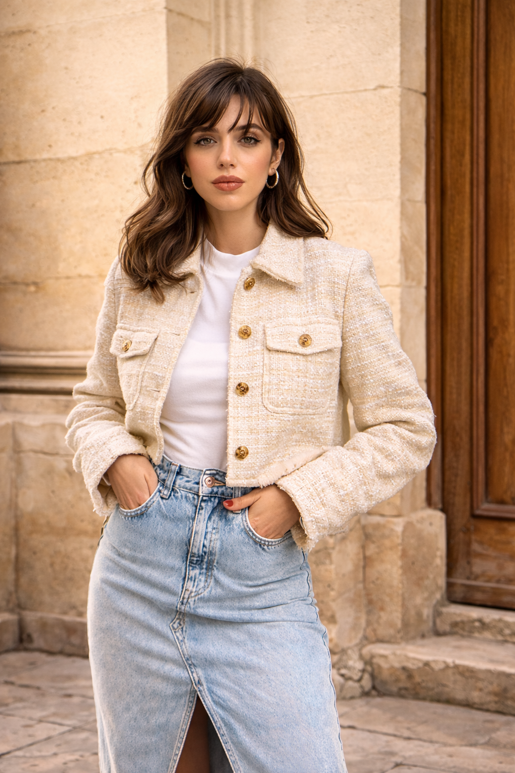 Elle peut aussi être portée avec une veste légère en fin de journée pour un style plus équilibré.